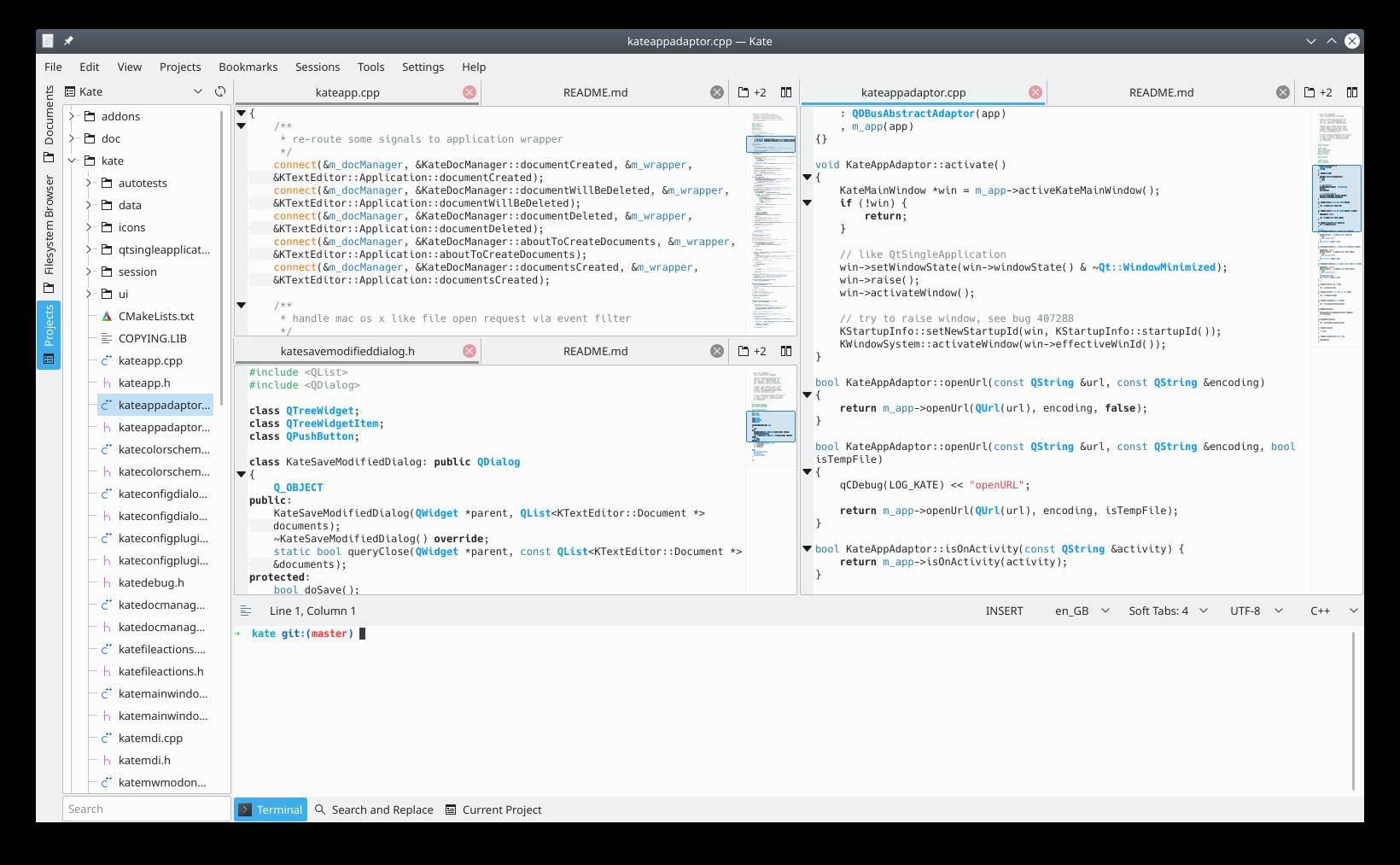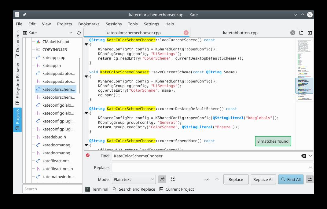 Može se koristiti kao uređivač. Također nudi ljusku SDI uređivača KWrite, koja korisniku omogućuje odabir omiljene komponente uređivača.Kate, KDE aplikacija, dolazi s mrežnom transparentnošću i integracijom s izvanrednim značajkama KDE-a. Pregled HTML resursa, uređivanje konfiguracijskih datoteka,Odaberite Kate za pisanje novih aplikacija ili bilo koji drugi zadatak uređivanja teksta.